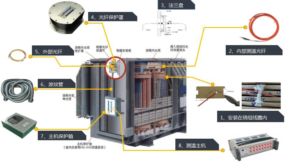 如圖所示,油浸式變壓器熒光光纖測溫系統(tǒng)由內(nèi)部光纖、法蘭盤、外部光纖、測溫主機組成,內(nèi)部光纖根據(jù)設(shè)計需求布置于繞組線圈、鐵芯、油面等部位,通過法蘭盤上的貫通器與外部光纖連接,光信號通過光纖傳導(dǎo)至測溫主機解析出測點溫度。
